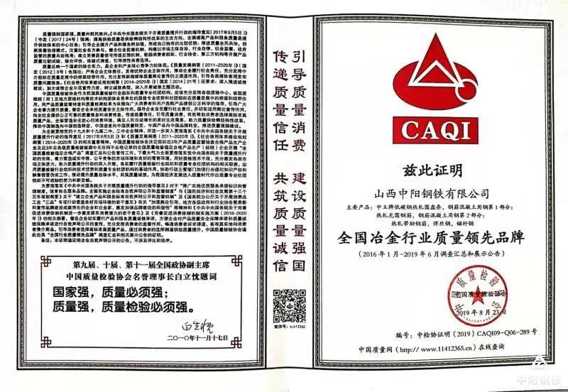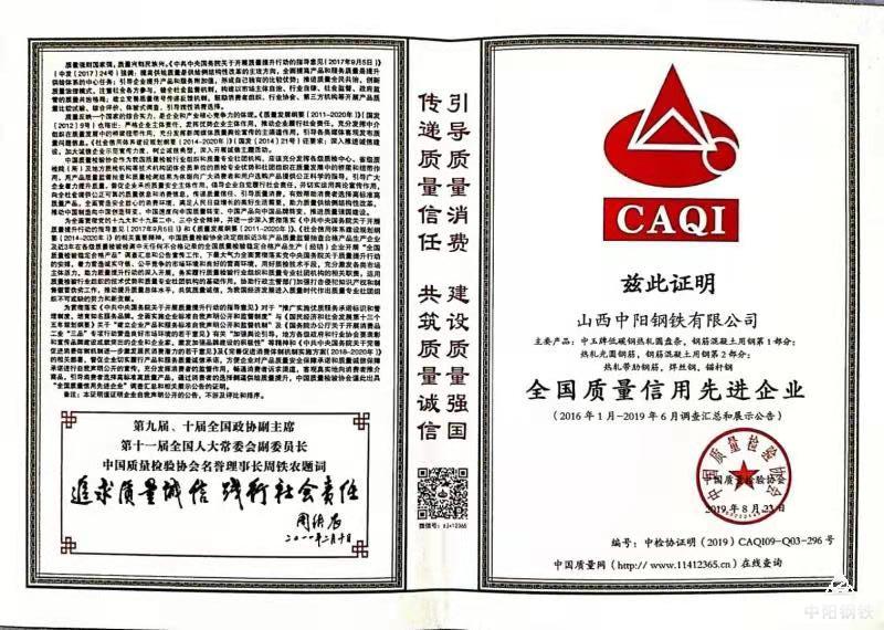 日前,凭借着优质的产品质量、完善的质量管理体系,中阳钢铁荣获“全国质量信用先进企业”殊荣,中玉牌低碳钢热轧圆盘条、钢筋混凝土用热轧光圆钢筋、钢筋混凝土用热轧带肋钢筋、焊丝钢、锚杆钢等产品荣获“全国冶金行业质量领先品牌”称号。