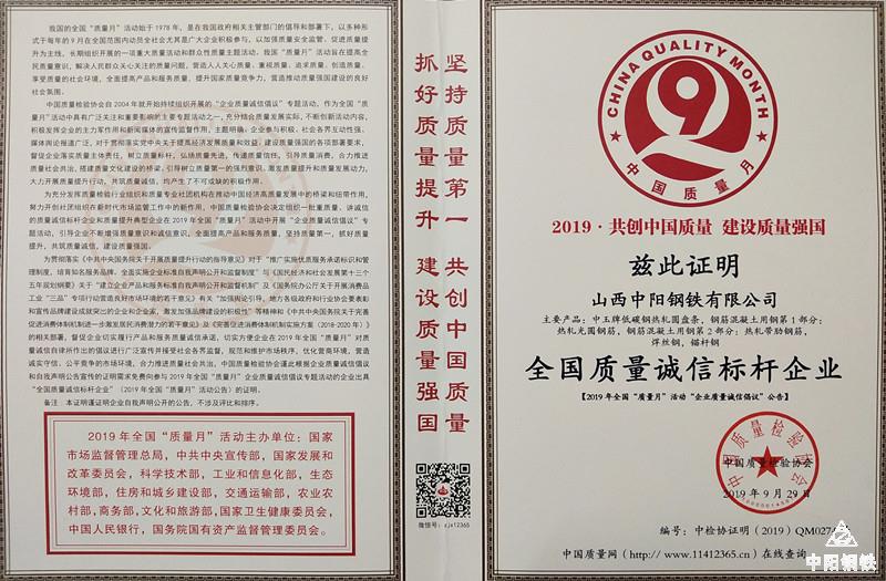 日前,在已落幕的9月全国“质量月”活动中,中阳钢铁再获新殊荣,被授予“全国质量诚信标杆企业”荣誉称号。