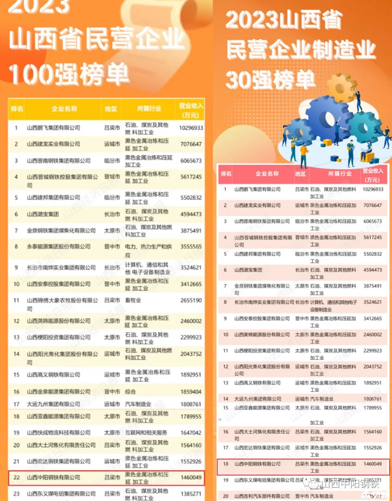 10月19日,2023山西省民营企业100强发布,中阳钢铁榜上有名。