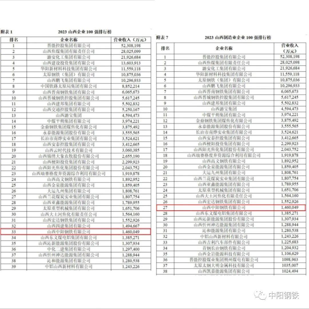 论坛重磅发布了2023山西企业100强、制造业企业100强、服务业企业100强等排行榜,中阳钢铁以1460049万元的营业收入,位列“2023山西企业100强”第33位,“2023山西制造业企业100强”第27位。