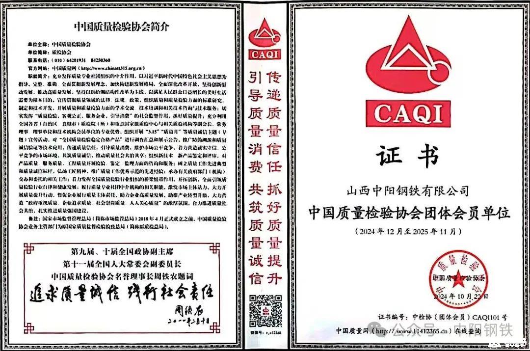 近日,中阳钢铁凭借过硬的产品质量,被中国质量检验协会评为“中国质量检验协会团体会员单位”。