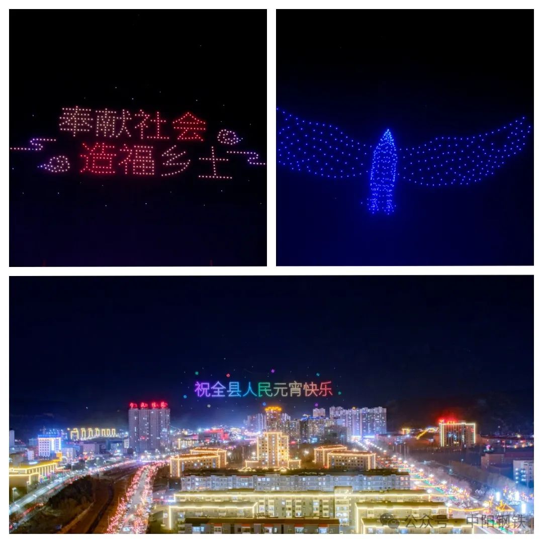 随着夜幕的降临,周边街道早已人头攒动,市民们满怀期待地等待着焰火晚会的开始。晚18时57分,政府县长孙燕飞按下启动按钮,在万众瞩目中,数千架无人机以夜空为画布,光影为笔触,编队构成了“我爱中阳”“福到中阳”“实施‘五大行动’ 发展新质生产力”“小木耳大产业”“文明中钢”等巨幅字样和图案,传递给全县人民的不仅仅是节日的祝福,更是中阳经济腾飞发展的信心。