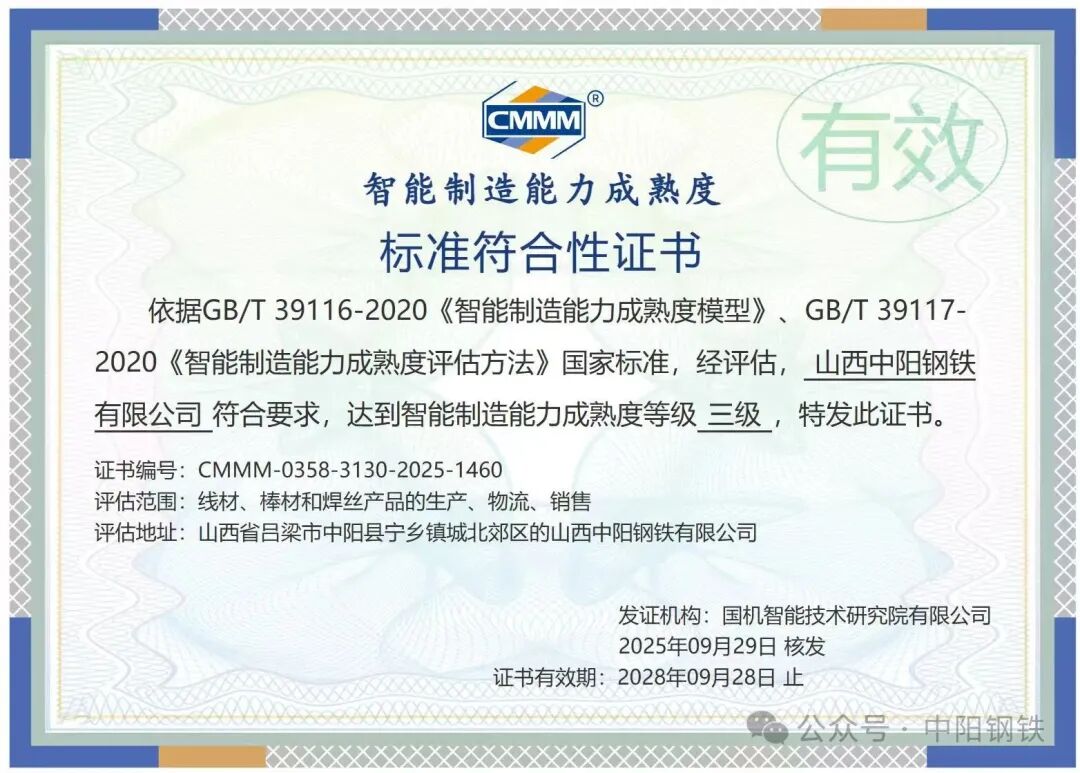 据悉,此次评估历时2个月,国机智能技术研究院有限公司依据GB/T39116-2020《智能制造能力成熟度模型》、GB/T39117-2020《智能制造能力成熟度评估方法》,对中阳钢铁线材、棒材和焊丝产品的生产、物流、销售等方面进行了深入且细致的评估。