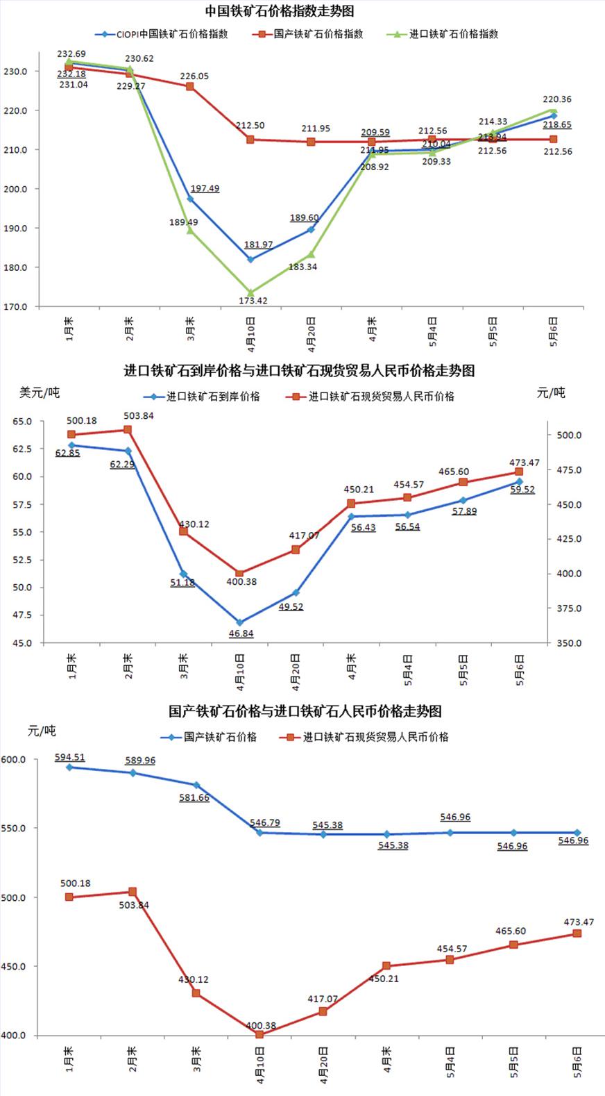 5月6日,中国铁矿石价格指数(CIOPI)218.65点,环比上升4.71点,升幅为2.20%。其中:国产铁矿石价格指数为212.56点,环比持平;进口铁矿石价格指数为220.36点,环比上升6.03点,升幅为2.82%。