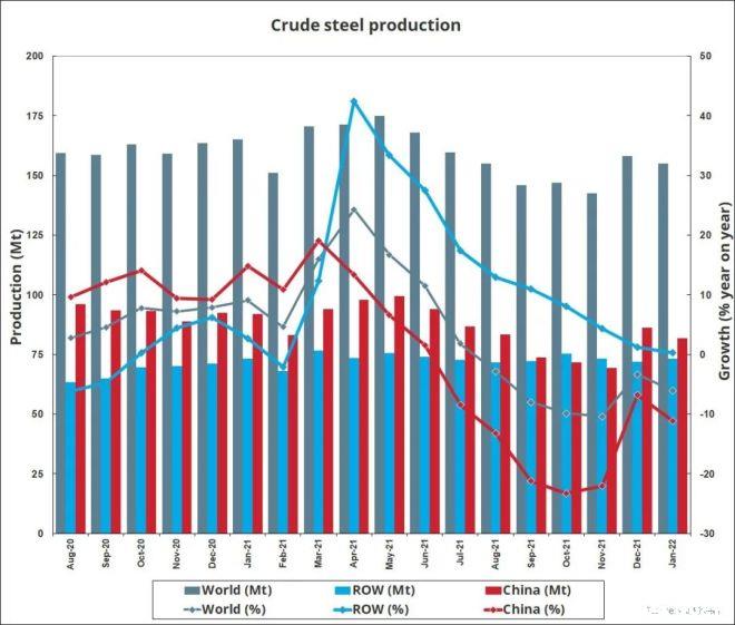 2022年1月全球64个纳入世界钢铁协会统计国家的粗钢产量为1.550亿吨,同比下降6.1%。
